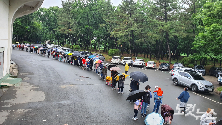 경주시가 홈플러스 방문 시민들을 대상으로 코로나19 검사를 요청하자 많은 시민들이 임시선별진료소가 설치된 시민운동장을 찾아 순서를 기다리고 있다. 문석준 기자