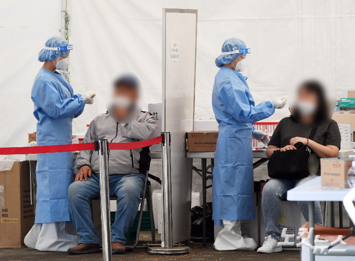 선별검사소에서 의료진이 검체채취를 하고 있다. 황진환 기자