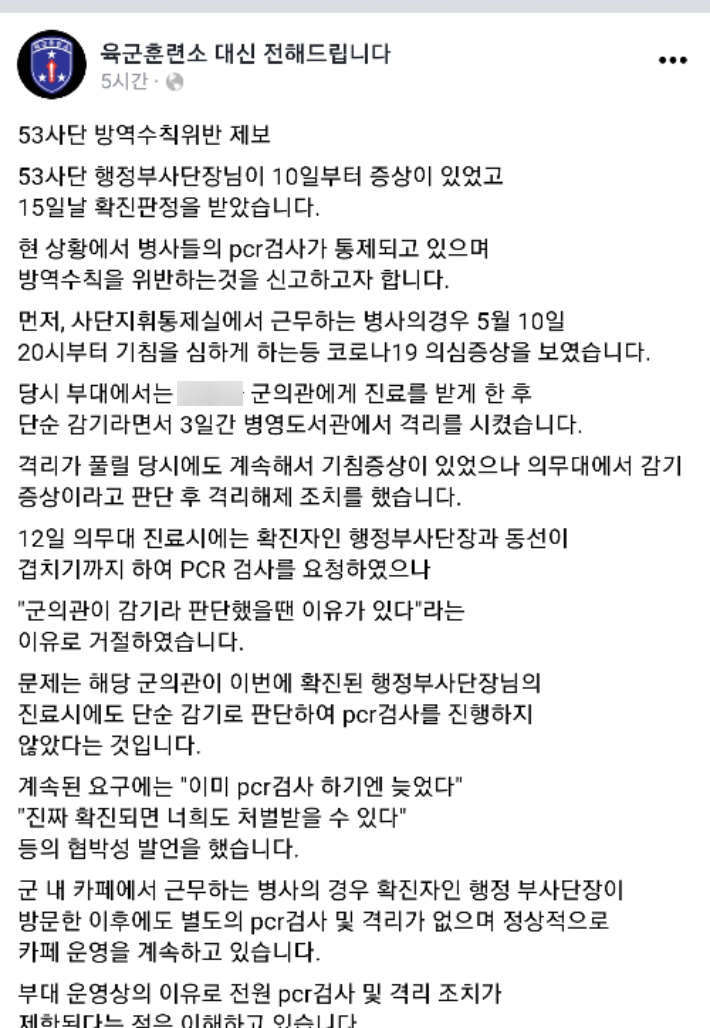19일 페이스북 페이지 <육군훈련소 대신 전해드립니다>에 '53사단 방역수칙위반 제보' 제목의 글이 게시됐다.