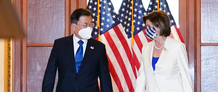 문재인 대통령과 낸시 펠로시 미국 연방하원의회 의장이 20일 오후(현지시간) 워싱턴 국회의사당에서 미국 연방하원의원 지도부와 간담회에 앞서 발언을 위해 연단으로 나오고 있다. 연합뉴스