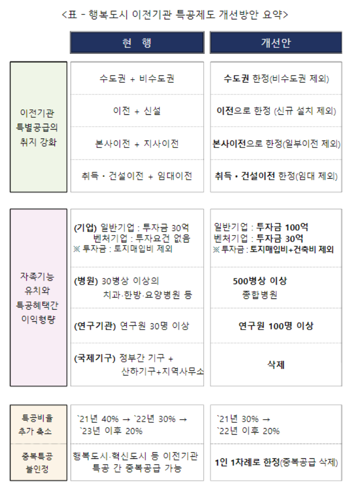 행정중심복합도시건설청이 지난 4월 이전기관 특공제도 개선 방안을 제시했지만, 각종 논란이 계속되면서 여론이 악화되고 있다. 행복도시건설청 제공