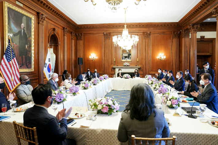 한편 간담회에서는 낸시 펠로시 하원의장이 지난해 문 대통령으로부터 받은 연하장을 꺼내들고 "아주 예뻐서 간직하고 있다. 인류의 평화와 번영을 위해 쉬지 않고 노력한다는 글도 감동적이었다"고 말해 눈길을 끌었다.