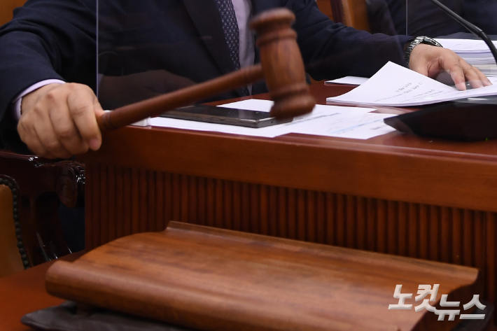 지난 3월 23일 오후 국회에서 법제사법위원회 전체회의가 열린 가운데 윤호중 위원장이 의사봉을 두드리고 있다. 윤창원 기자