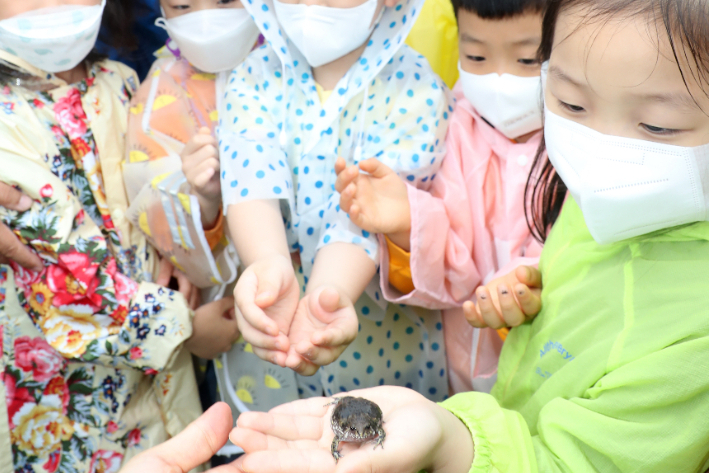 전북 전주시와 전주생태하천협의회는 21일 홍산교 옆 삼천 생태학습장에서 230여 마리의 맹꽁이 방사 행사를 가진 가운데 서곡의 유치원생 20여 명이 맹꽁이를 관찰하고 있는 모습. 전주시 제공