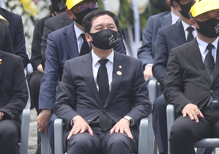 국민의힘 김기현 원내대표 겸 당대표 권한 대행이 23일 경남 김해시 진영읍 봉하마을에서 엄수된 노무현 전 대통령 서거 12주기 추도식에 참석해 추도사를 경청하고 있다. 연합뉴스