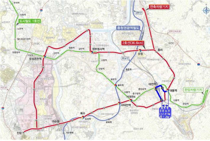 대전 도시철도 2호선은 연장 36.6km 정거장 35곳, 차량기지 1곳을 설치하는 것으로 현재 기본 및 실시설계를 추진하고 있다. 내년 말 설계가 끝나면 공사에 들어가 2027년 개통이 목표다.