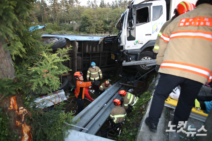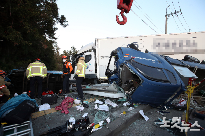 이 사고로 버스 승객 박모(74‧여)씨와 버스정류장에서 대기하고 있던 김모(29)씨, 관광객 이모(32)씨가 숨졌다. 또 1톤 트럭 운전자와 버스 승객 등 59명이 중‧경상을 입었다.