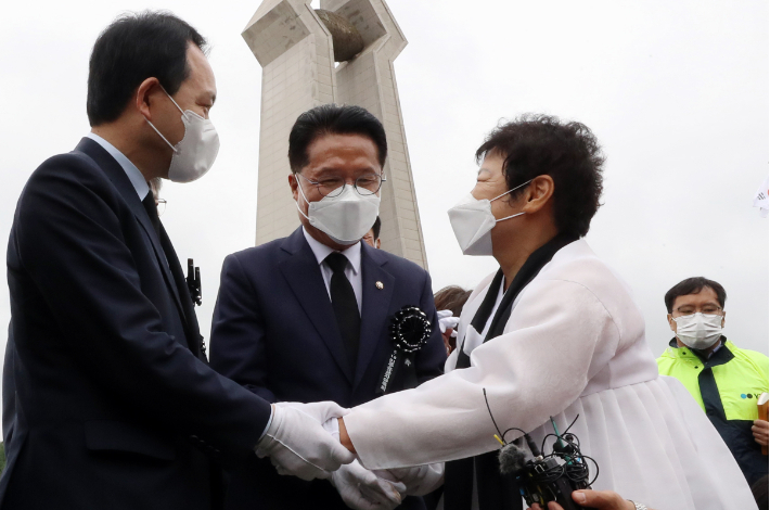 제41주년 5·18 민주화운동 기념일을 하루 앞둔 17일 오전 광주 북구 국립 5·18 민주묘지에서 열린 추모제에 유족의 초청으로 참석한 국민의힘 성일종(왼쪽), 정운천(가운데) 의원이 유족과 손을 잡고 있다. 연합뉴스