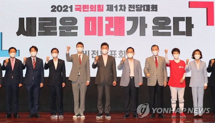 국민의힘 당대표 선거에 출마한 나경원(오른쪽부터), 김은혜, 홍문표, 주호영, 윤영석, 김웅, 조경태, 이준석 후보와 김기현 당 대표 권한대행이 25일 서울 마포구 누리꿈스퀘에서 열린 '제1차 전당대회 비전발표회-당 대표 및 청년최고위원 후보자'에서 함께 기념촬영을 하고 있다. 2021.5.25 (사진=연합뉴스)