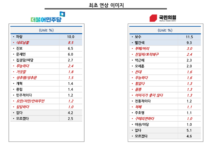 반면에 ‘국민의힘 하면 뭐가 떠오르냐’ 보수 11.5%, (당 상징색인) 빨간색 9.3%, 비리 3%, 친일파/토착왜구 2.4%, 박근혜 2.3%, 오세훈 2%, 꼰대 1.6%, 무능하다 1.6%. 이렇게 나왔어요. 이거를 보고서가 의인화 해서 한 문장으로 표현을 했더라고요. 민주당의 이미지를 의인화해 보면 ‘독단적이고 말만 잘하며 겉과 속이 다른 성과 없는 무능한 40대, 50대 남성’ 국민의힘은 ‘돈과 권력을 중시하며 엘리트 주의를 가지고 있는 50대 후반에서 70대 꼰대 남성. 이렇게’ 양당 다 아파요. 어떻게 생각하세요?