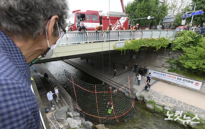 26일 오후 서울 종로구 배오개다리에서 서울시설공단, 서울중부소방서 등 관계자들이 '2021년 청계천 시민구조 합동 모의훈련'을 하고 있다. 모의훈련은 청계천 유역에 갑자기 많은 비가 쏟아진 상황을 가정해 상황센터와 현장에서 동시에 이루어진다. 상황센터는 위급상황 발생 시 사이렌과 대피방송, 전광판 표출 등을 통해 시민의 청계천 출입을 통제하고 현장에서는 119와 합동으로 시설 안전요원과 대피 통제반이 긴급 투입하여 시민 대피, 시민통제 등에 나선다.