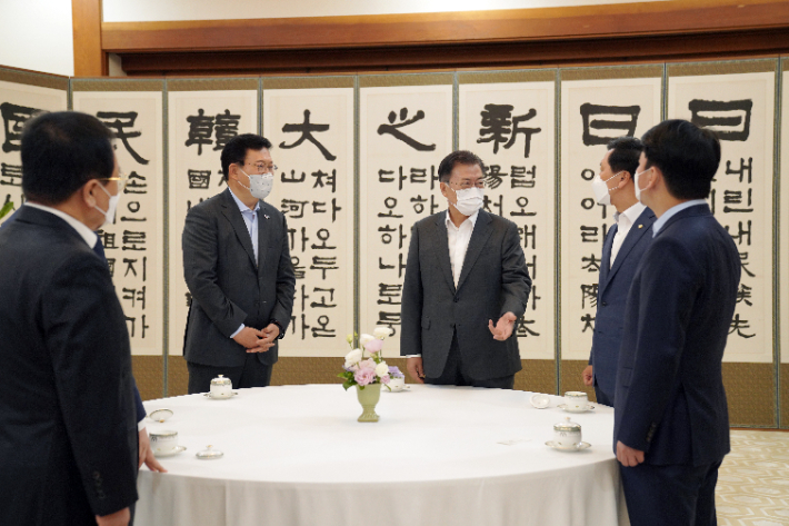 송영길 더불어민주당 대표는 26일 야당 대표들과 함께 문재인 대통령을 만난 오찬 자리에서 한미 정상회담의 여러 성과를 치켜세우면서도 전시작전권과 관련한 아쉬움을 드러냈다.