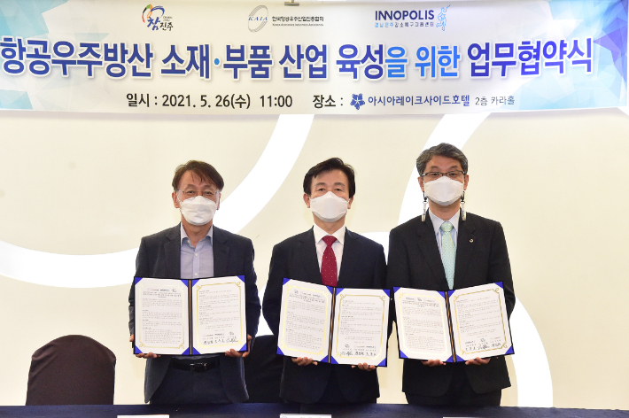 진주시가 한국항공우주산업진흥협회, 경남진주강소특구지원센터와 함께 항공우주부품·소재산업 육성을 위한 3개 기관 업무 협약을 맺었다.