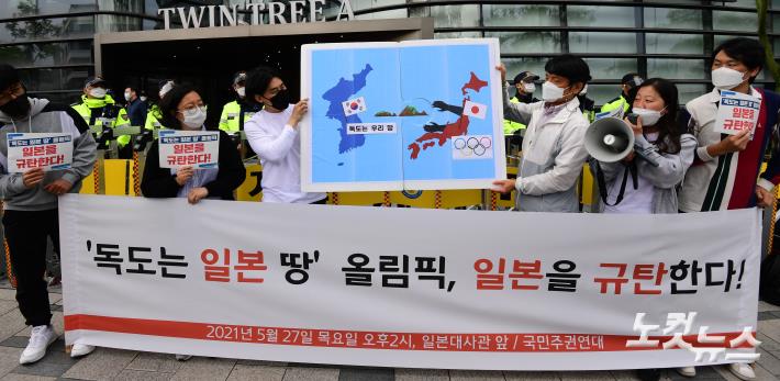 국민주권연대 관계자들이 27일 오후 서울 종로구 주한일본대사관 앞에서 ‘독도는 일본땅’ 올림픽, 일본규탄 기자회견을 갖고 있다.