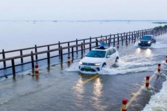 물이 넘친 장시성 지우장시의 호수주변 도로에서 차량들이 아슬아슬하게 지나가고 있다. 바이두 홈페이지 캡처