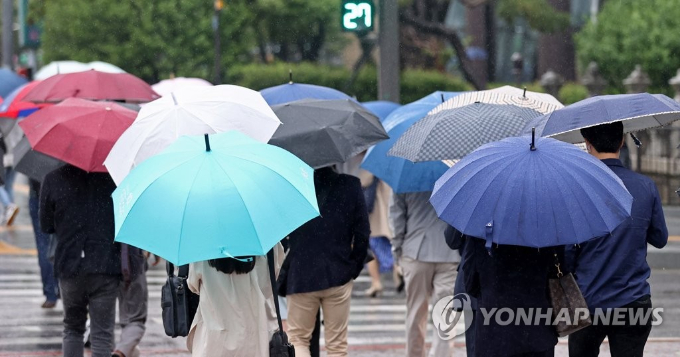(서울=연합뉴스) 류영석 기자 = 전국 대부분 지역에 비가 내리는 27일 오전 서울 광화문 광장에서 시민들이 우산을 쓰고 걸어가고 있다. 2021.5.27 ondol@yna.co.kr 연합뉴스