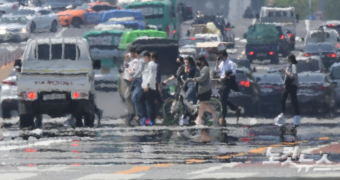 서울 한 낮 최고 기온이 29도를 기록하며 초여름 날씨를 나타낸 13일 오후 서울 여의도 도로에 지열로 인한 아지랑이가 피어오르고 있다. 이한형 기자
