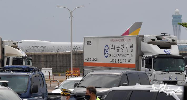 코로나19 모더나 백신의 첫 번째 도입물량 5만5000회분이 실린 화물기가 1일 오후 인천국제공항 화물터미널에 도착하고 있다. 모더나 백신은 국가출하승인 절차를 거쳐 이달 중순 공급되며 30대 미만 병원급 의료기관 종사자의 접종에 활용될 계획이다.