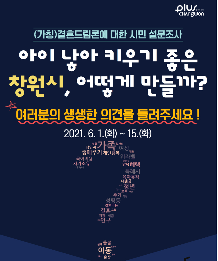 창원시가 올해 1월 발표한 파격적인 결혼·출산장려책 '(가칭)결혼드림론'의 도입 취지와 정책 내용 등에 있어 더 많은 시민이 공감할 수 있도록 보완하기 위해 6월 1일부터 15일까지 온라인 시민 설문조사를 실시한다.
