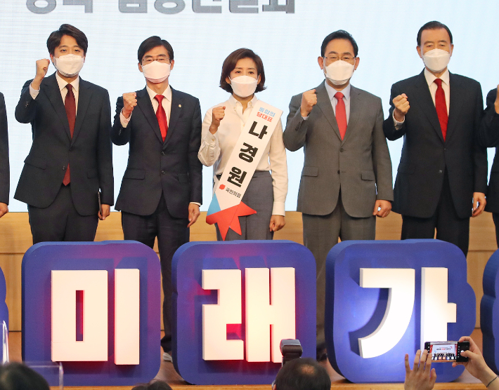 3일 오후 대구 북구 엑스코에서 열린 '2021 국민의힘 1차 전당대회 대구·경북 합동연설회'에서 당 대표 후보들이 인사하고 있다. 연합뉴스