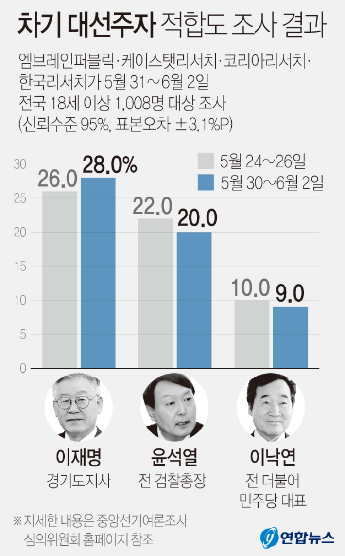 엠브레인퍼블릭·케이스탯리서치·코리아리서치·한국리서치 등 4개 여론조사기관이 지난달 31일부터 이달 2일까지 전국 성인남녀 1008명을 대상으로 실시해 3일 발표한 6월1주차 전국지표조사(NBS) 대선후보 적합도 조사에서 이 지사가 28%를 얻어 20%인 윤석열 전 검찰총장에 앞선 것도 이러한 요소들이 복합적으로 작용했다는 평가다.(표본 오차는 95% 신뢰수준에서 ±3.1%p. 자세한 내용은 중앙선거여론조사심의위원회 홈페이지 참조)