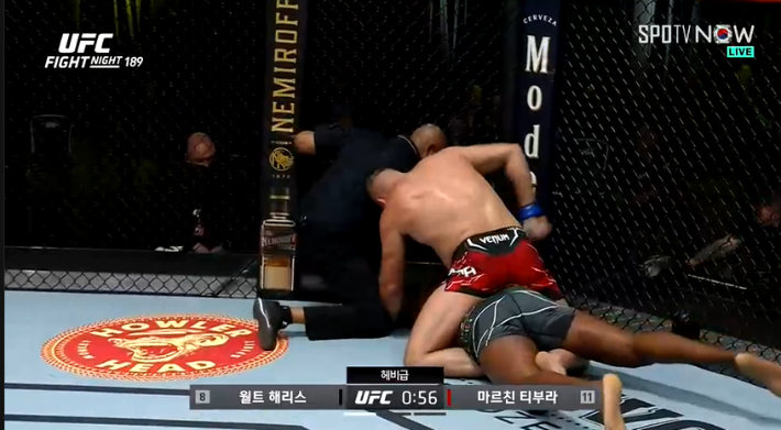 결국 티부라는 완벽하게 해리스의 등에 올라탄 뒤 파운딩을 이어갔고 단 한 번의 데이크다운으로 1라운드 4분 6초 만에 TKO 승을 거머쥐었다.