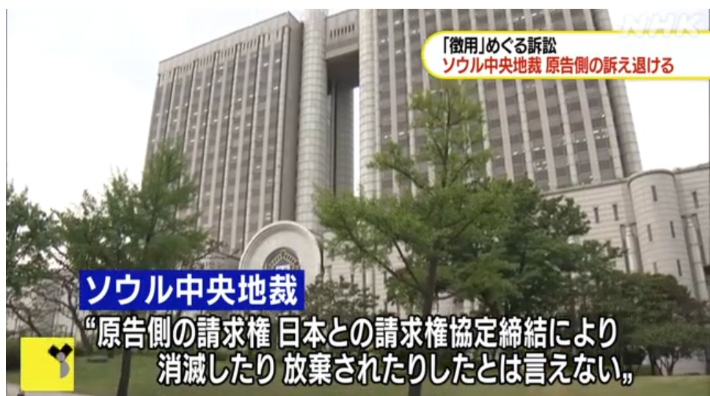 서울중앙지법이 강제징용 노동자와 유족 85명이 일본제철과 미쓰비시중공업 등 일본 기업 16곳을 상대로 낸 손해배상 소송을 7일 각하했다. NHK캡처