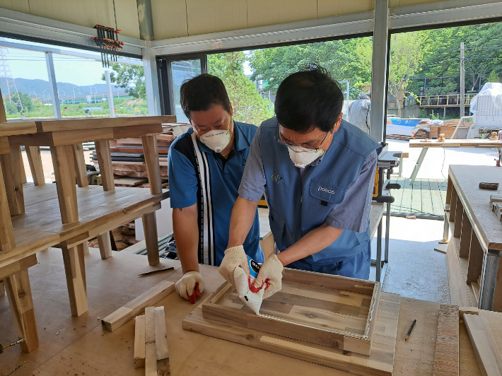 포항제철소 직원들이 8일 목공예 봉사를 실시했다. 포스코 제공