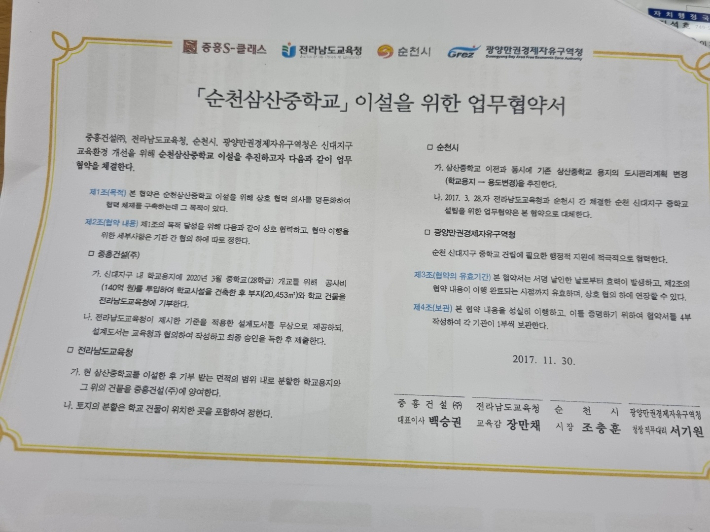8일 순천교육지원청(이하 순천교육청)에 따르면 지난 2017년 11월 30일 전남도교육청과 J 건설, 순천시, 광양만권경제자유구역청은 순천 삼산중학교 이설을 주 내용으로 하는 업무협약을 체결했다.
