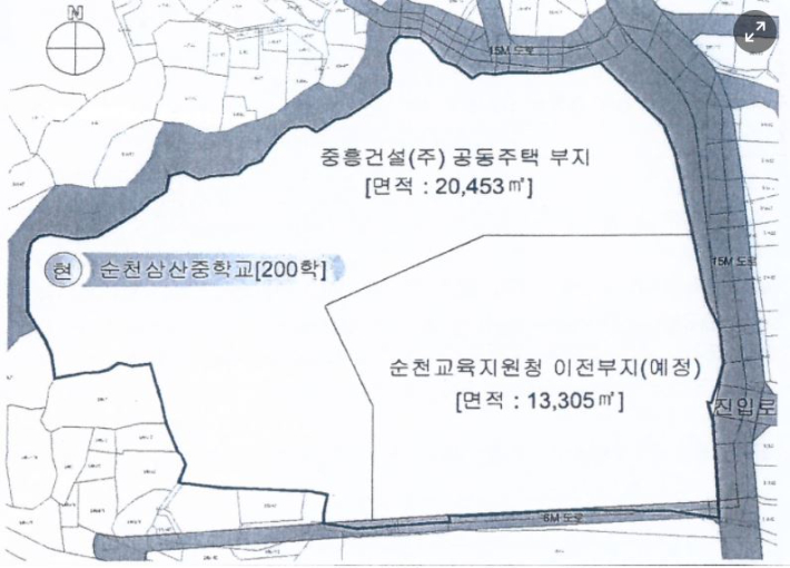기존 분할 방식이란 협약서에 따르면 삼산중 본관과 체육관 건물을 포함한 거꾸로 된 ㄱ모양의 부지는 J 건설에 양여하고, 남은 1만3305 ㎡규모의 땅을 순천교육청이 소유한다.