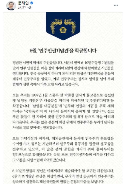 문재인 대통령은 6.10 민주항쟁 34주년을 맞은 10일 민주인권기념관 착공을 SNS를 통해 직접 알렸다.