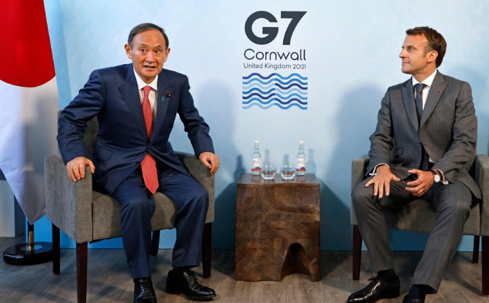영국 콘월주 카비스 베이에서 열린 주요 7개국(G7) 정상회의에 참석 중인 스가 요시히데(왼쪽) 일본 총리와 에마뉘엘 마크롱 프랑스 대통령이 지난 12일(현지시간) 양자 회담을 하고 있다. 연합뉴스