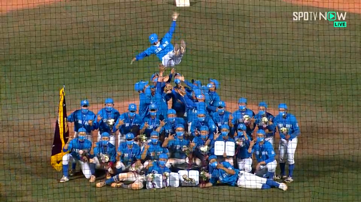 황금사자기 우승 후 세리머리를 하고 있는 강릉고 야구부. SPOTV 캡쳐