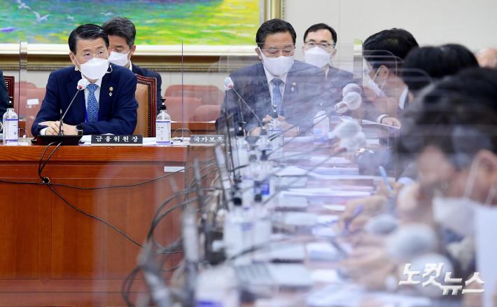 22일 국회에서 열린 정무위원회 전체회의에서 은성수 금융위원장이 이정문 더불어민주당 의원의 질의에 답하고 있다.