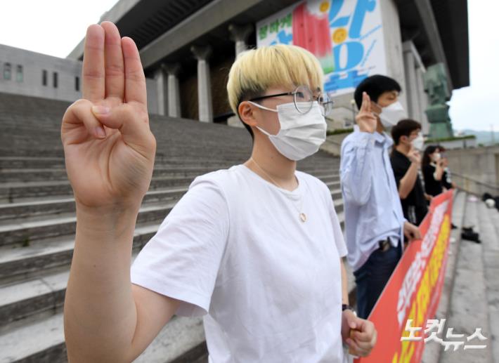 23일 오후 서울 종로구 세종문화회관 앞에서 열린 ‘미얀마 쿠데타 난민 지위 인정 촉구 기자회견’ 참석자들이 지난 10일 한국에 난민 신청한 미얀마 시민 4명의 난민 지위 인정을 촉구하고 있다.