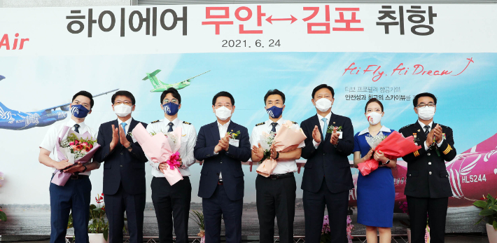무안~김포 간 하늘길을 연결하는 '하이에어(Hi-Air)'의 신규 노선 취항식이 24일 무안국제공항에서 열렸다.