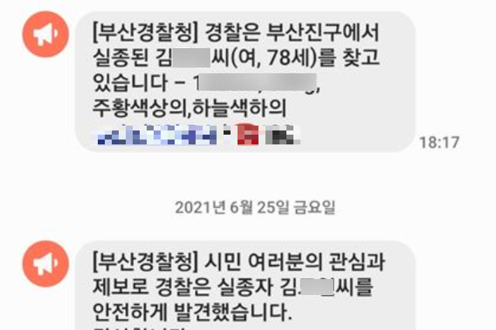 실종경보 송출 23분만인 이날 오후 6시 40분쯤 사상구 모아파트 경비원이 경보문자와 일치하는 대상자를 발견해 112로 신고했다. 이후 A씨는 소중한 가족품으로 돌아갔다.