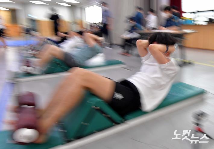 2023년 의무경찰 폐지를 앞두고 마지막 의경을 뽑는 제378차 선발시험이 진행 중인 가운데 25일 오후 서울 중구 서울경찰청 기동본부에서 지원자들이 체력 검사를 받고 있다.