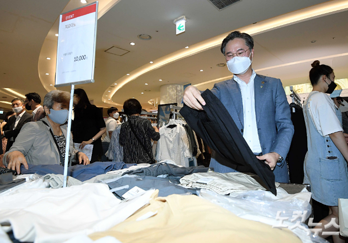 지난 25일 서울 송파구 롯데백화점 잠실점에서 열린 코리아패션마켓 시즌3 개막식에서 제품을 구매하는 박진규 산업통상자원부 차관. 박종민 기자