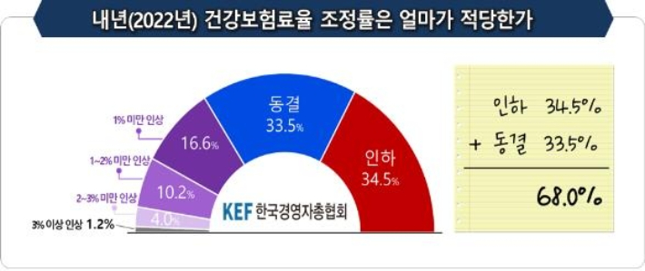 한국경영자총협회(경총)는 설문조사기관 나우앤퓨처에 의뢰해 전국 만20세 이상 남녀 1천 명을 대상으로 '국민건강보험 현안에 대한 대국민 인식조사'를 실시한 결과 68.0%가 내년도 건강보험료율을 인하 또는 동결해야 한다는 입장인 것으로 조사됐다고 27일 밝혔다.