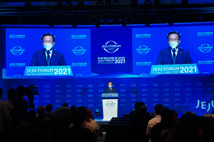 김부겸 국무총리가 지난 26일 제주해비치호텔에서 제16회 제주포럼 폐막연설을 하고 있다. 제주도 제공