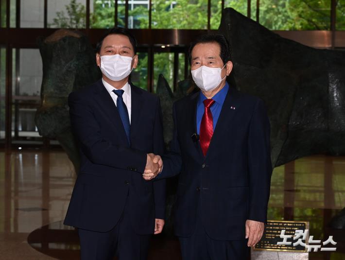 여권 대선 후보인 정세균 전 국무총리와 이광재 더불어민주당 의원이 28일 오전 서울 영등포구 한국거래소에서 단일화 추진 발표 기자회견에 앞서 악수를 나누고 있다.