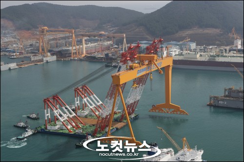 대우조선해양은 최근 폭 180m, 높이 90m의 거대한 골리앗 크레인을 사전에 제작해 조선소의 선박건조 작업에 지장을 주지 않고 단시간 내에 설치 운용이 가능하게 만든 두대의 병렬 해상크레인을 이용한 원타임 세팅 공법을 성공리에 마쳤다고 밝혔다.