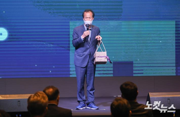최문순 강원도지사가 1일 서울 여의도 글래드호텔에서 열린 공명선거 실천 서약식 및 프레스데이 사전행사 '너 나와'에서 후보들에게 줄 감자 바구니를 들어보이고 있다.