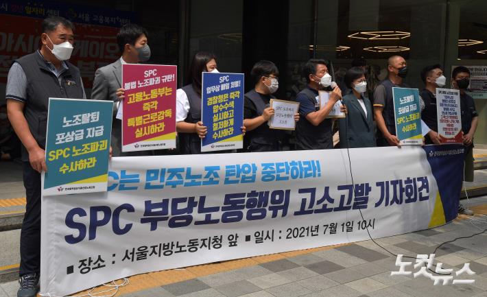 전국화학섬유식품산업노동조합이 1일 서울 중구 서울고용노동청 앞에서 SPC 부당노동행위 고소고발 기자회견을 하고 있다.