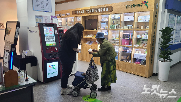 1일 광주 북구청 민원실에서 무인민원발급기를 이용하려는 80대 노인이 공공일자리 사업 참여자의 도움을 받고 있다. 김한영 기자