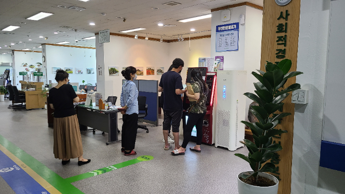 1일 광주 5개 자치구가 구청 민원실과 동 행정복지센터을 대상으로 점심시간 휴무제를 시행한 가운데 광주 북구청 민원실을 찾은 시민들이 무인민원발급기를 사용하기 위해 줄을 서고 있다. 김한영 기자