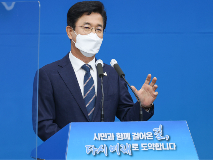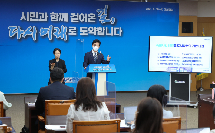 허태정 대전시장이 민선 7기 취임 3주년을 맞아 기자회견을 하고 있다. 대전시 제공