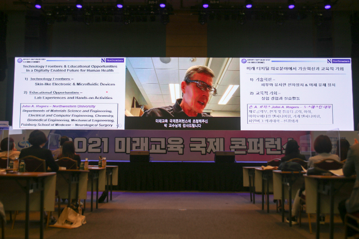 노스웨스턴대학교 존 에이 로저스 교수는 '첨단 기술의 발전과 교육에의 연계: 융합인재 육성'을 주제로 한 기조강연에서 신소재를 통한 최첨단 융합기술 플랫폼으로 수집된 정보가 교육분야에 어떻게 영향을 미치는지에 대한 연구결과를 다양한 사례를 통해 공유했다.