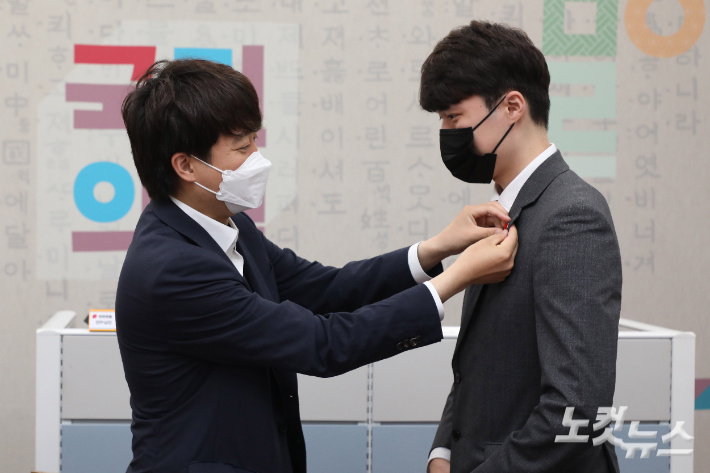 양준우 대변인 내정자에게 당 배지 달아주는 이준석 대표